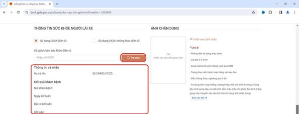 Nếu lựa chọn Giấy khám sức khỏe điện tử, người dân nhập số giấy khám sức khỏe và chọn tra cứu. Kết quả sẽ hiển thị bên dưới.