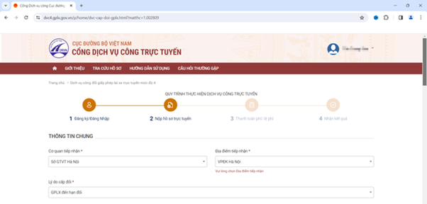 Bước 4: Nhập Thông tin chung, người dân lựa chọn cơ quan tiếp nhận theo nơi cấp đổi giấy phép lái xe của mình, hệ thống sẽ tự nhập địa điểm tiếp nhận. Sau đó lựa chọn lý do cấp đổi theo từng cá nhân.