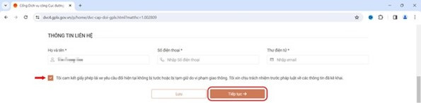 Bước 8: Người dân điền thông tin liên hệ sau đó bấm chọn vào ô cam kết rồi nhấn tiếp tục.