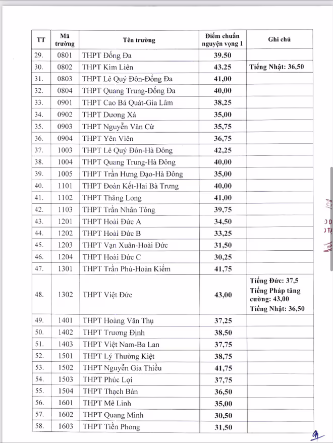 Điểm chuẩn cụ thể các trường THPT công lập Hà Nội như sau: