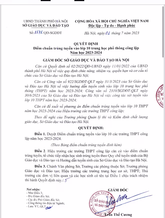 Hà Nội công bố điểm chuẩn lớp 10 công lập năm học 20233-2024 |