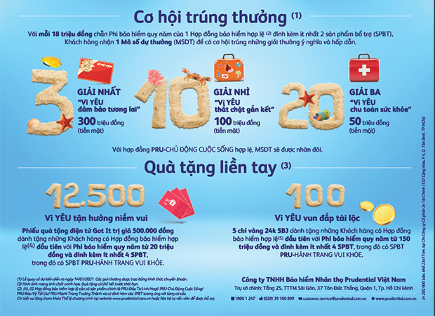 Để biết thêm thông tin chi tiết của chương trình khuyến mại, vui lòng truy cập: https://www.prudential.com.vn/vi/our-services/chuong-trinh-khuyen-mai/chuong-trinh-trao-nhieu-vi-yeu-thuong/
