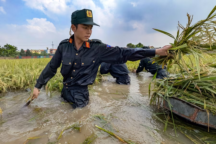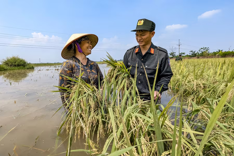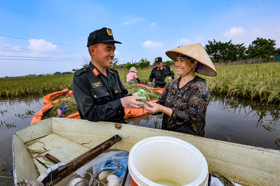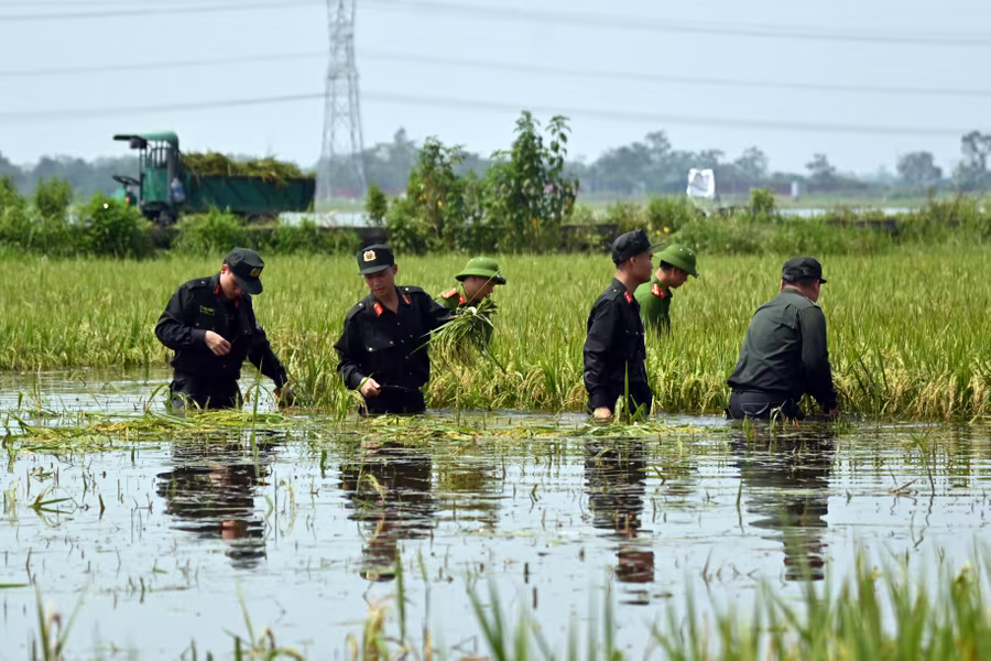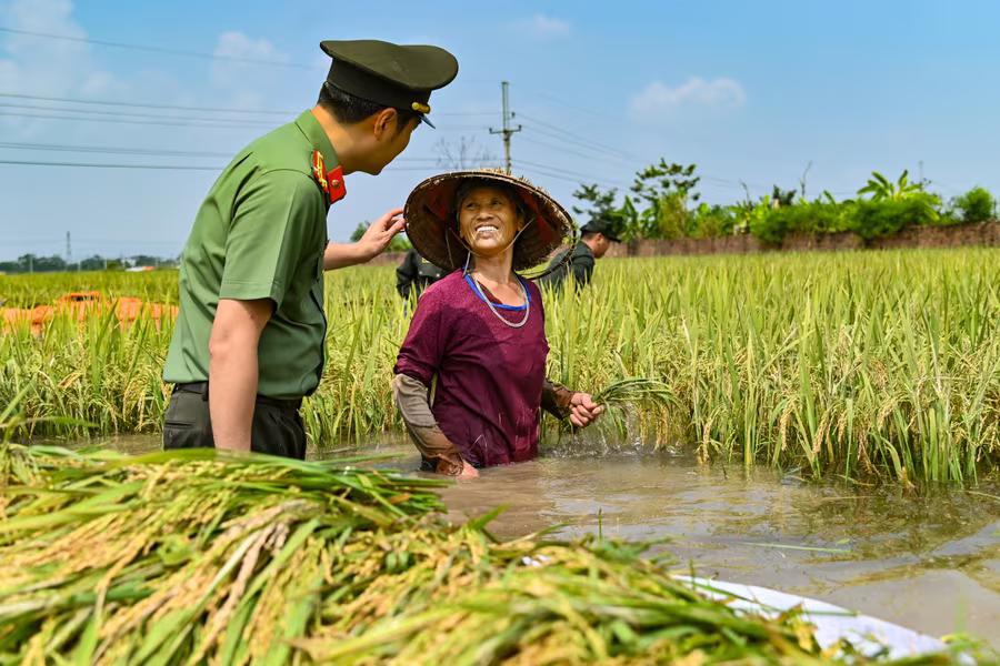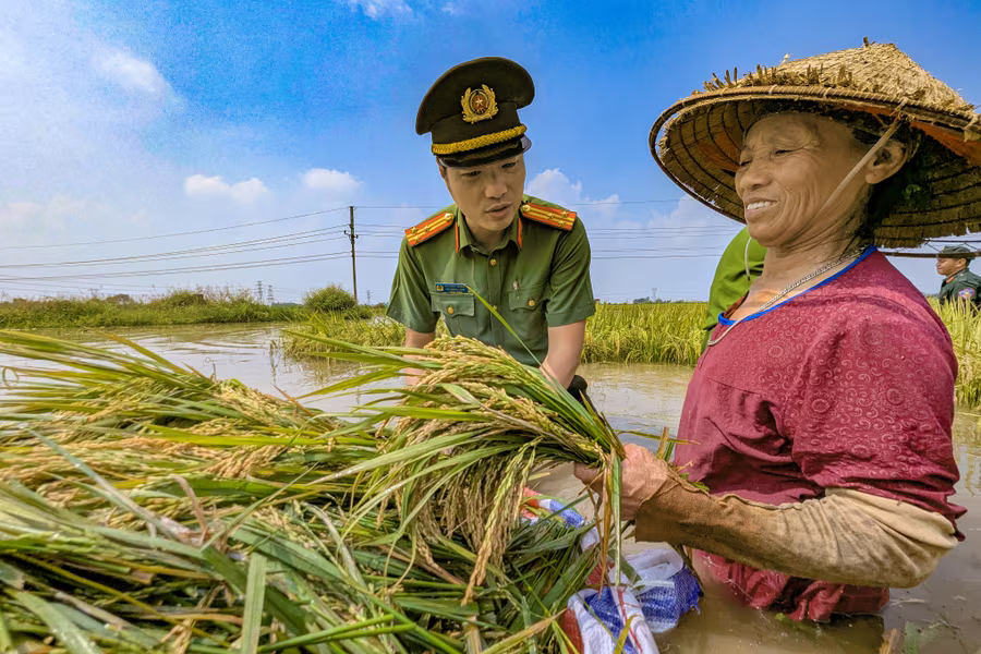 Hình ảnh xúc động khi hàng trăm cán bộ, chiến sỹ Công an Thủ đô dọn dẹp sau ngập lụt giúp người dân xã Trung Giã