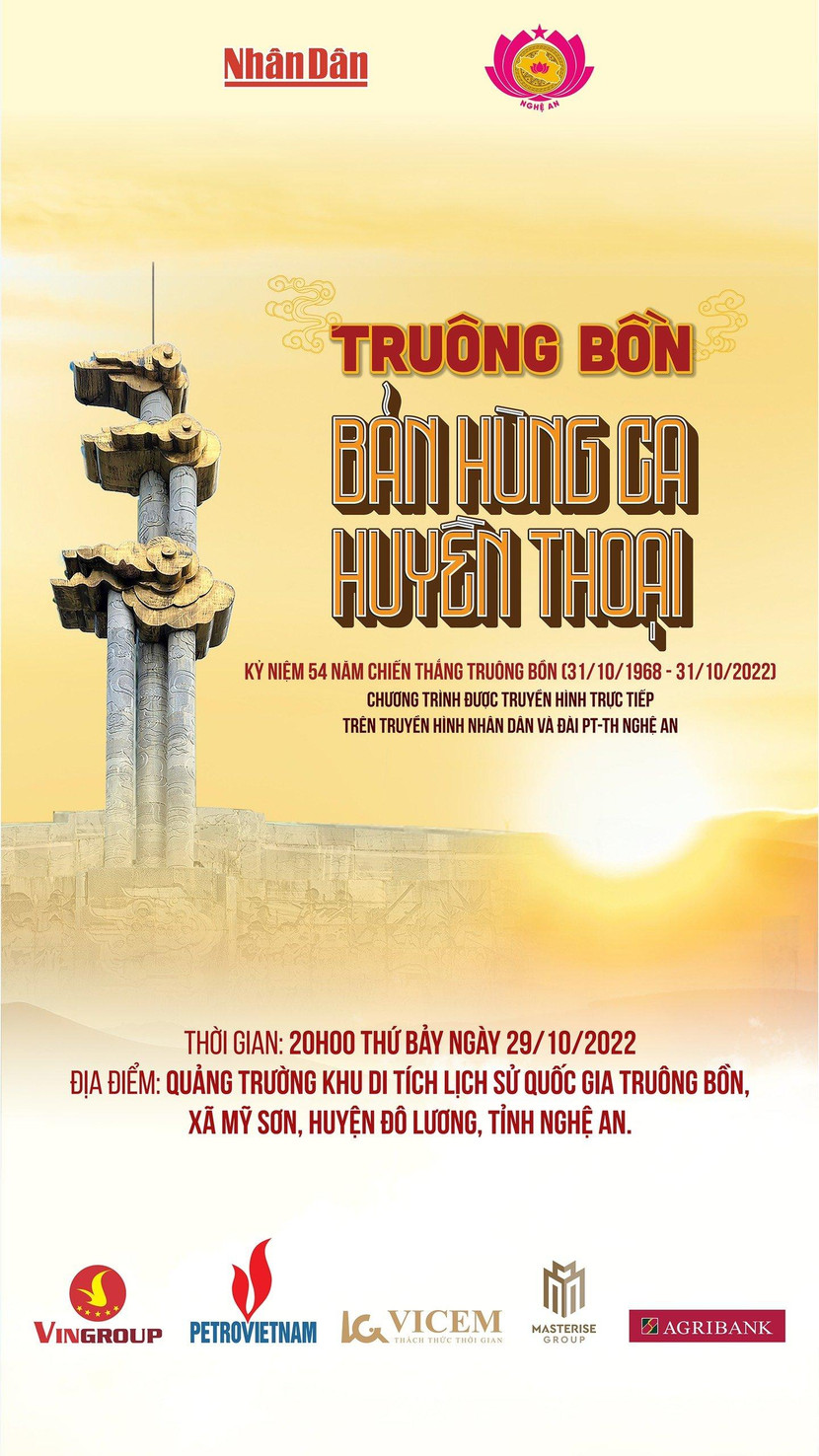 Chương trình nghệ thuật sẽ diễn ra tại sân khấu chính tại quảng trường Khu di tích Truông Bồn. Sân khấu được dàn dựng với hệ thống âm thanh, ánh sáng hiện đại, tạo nên không khí trang trọng, bi tráng để kể câu chuyện xúc động và rất đỗi tự hào về mảnh đất huyền thoại Truông Bồn.