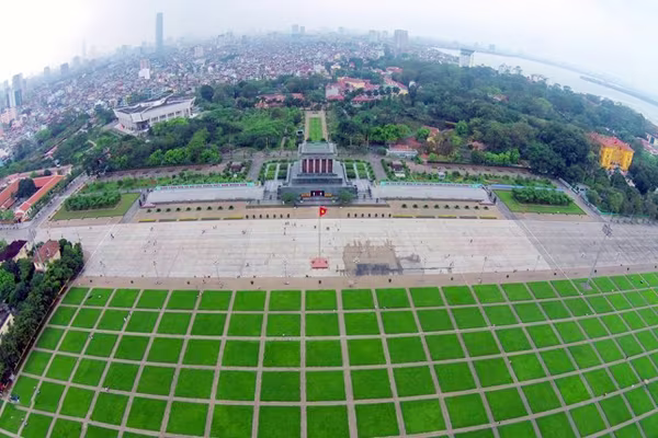 Trong hồi ký của kiến trúc sư Nguyễn Khởi, thành viên ban xây dựng lăng có viết: “Tôi còn nhớ, trong một buổi nói chuyện, ông Vũ Kỳ (thư ký của Bác Hồ) có kể với tôi rằng, mỗi buổi diễu hành, diễu binh, các chiến sỹ bộ đội hoặc lực lượng công nông tham gia các sự kiện thường phải tập hợp từ rất sớm và đứng đến trưa nên rất mệt. Có trường hợp đã bị ngất xỉu do trời nắng nóng, mà nền quảng trường lại là bê tông nên càng nóng. Chính những trao đổi, bàn bạc qua lại đó đã khiến tôi nảy ra ý tưởng tại sao không thiết kế quảng trường Ba Đình là những thảm cỏ thay vì bê tông. Tôi trình bày với ông Vũ Kỳ, ông hỏi lại tôi rất kỹ chuyện đó dưới góc độ chuyên môn kiến trúc để trình bày với Bộ Chính trị. Vài hôm sau, ông Vũ Kỳ thông báo lại với tôi là Bộ Chính trị đã đồng ý làm nền quảng trường Ba Đình là thảm cỏ”.