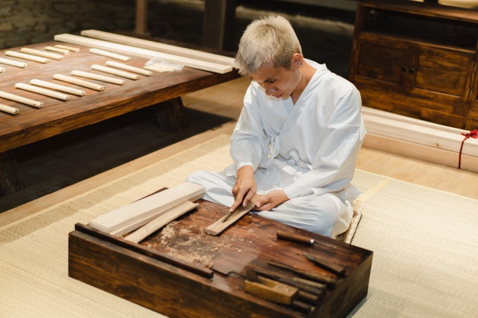 Tại quầy chế tác bao kiếm, du khách sẽ được quan sát nghệ nhân chế tác bao kiếm và cán kiếm từ các loại gỗ nhẹ và bền như mộc lan Nhật Bản (gỗ ho) hoặc gỗ anh đào Nhật Bản cùng nguyên liệu làm vỏ kiếm, các dụng cụ đục, bào truyền thống.