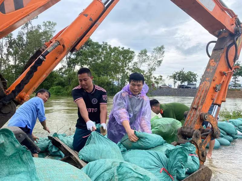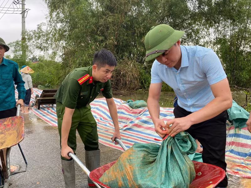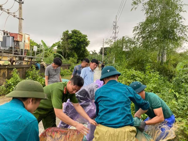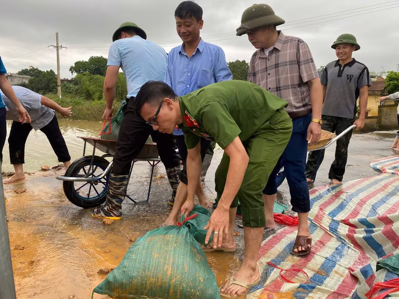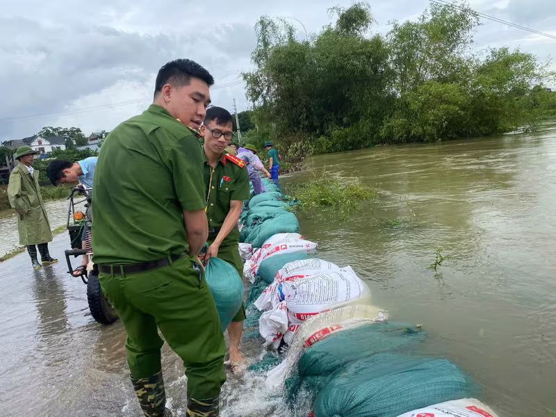 Công an các xã ven sông đắp bao cát ngăn nước tràn vào nhà dân