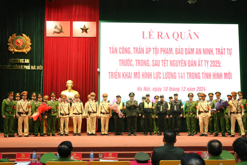 "Với tinh thần trên, thực hiện Mệnh lệnh ra quân thực hiện cao điểm của Bộ trưởng Bộ Công an, tôi yêu cầu các đơn vị, lực lượng của CATP bắt đầu 8h ngày 15-12-2024 đến ngày 14-2-2025 đồng loạt ra quân tấn công, trấn áp tội phạm bảo đảm an ninh trật tự trước, trong và sau Tết Nguyên đán Ất Tỵ 2025; đồng thời từ hôm nay sẽ triển khai lực lượng 141 theo mô hình mới trên toàn thành phố. Chúc các đơn vị, lực lượng hoàn thành xuất sắc các mục tiêu, chỉ tiêu, nhiệm vụ được giao trong đợt ra quân, thực hiện cao điểm với tinh thần khí thế, quyết tâm mới" - Trung tướng Nguyễn Hải Trung phát lệnh cao điểm.