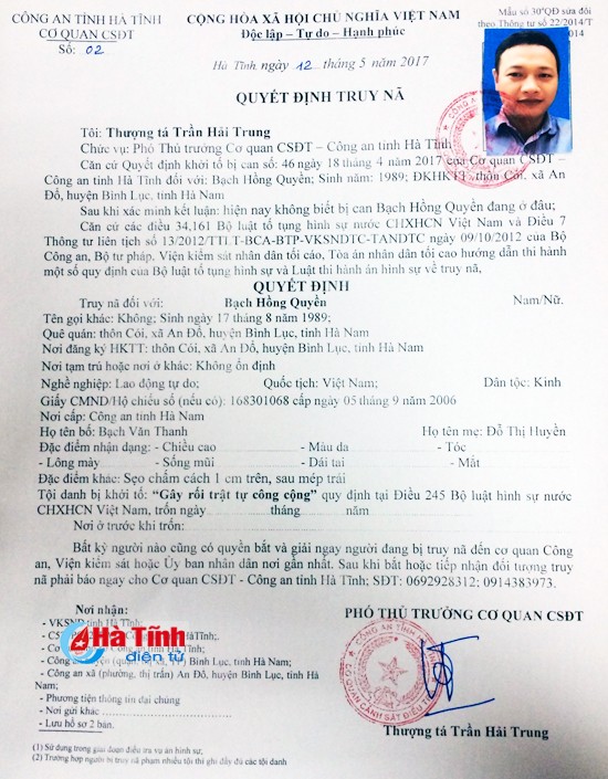 Sau khi xác minh cơ quan Cảnh sát điều tra Công an Hà Tĩnh kết luận, hiện nay không biết bị can Bạch Hồng Quyền đang ở đâu. Căn cứ vào các điều 34, 161 Bộ luật Tố tụng hình sự nước CHXHCN Việt Nam và điều 7 Thông tư liên tịch số 13/2012/TTLT-BCA-BTP-VKSNDTC-TANDTC ngày 9/10/2012 của Bộ Công an, Bộ Tư pháp, Viện kiểm sát nhân dân tối cao, Tòa án nhân dân tối cao hướng dẫn thi hành một số quy định của Bộ luật Tố tụng hình sự và Luật Thi hành án hình sự về truy nã, ngày 12/5/2017, cơ quan Cảnh sát điều tra Công an tỉnh Hà Tĩnh ra quyết định truy nã số 02 đối với Bạch Hồng Quyền về tội gây rối trật tự công cộng.