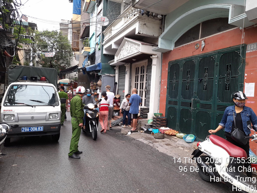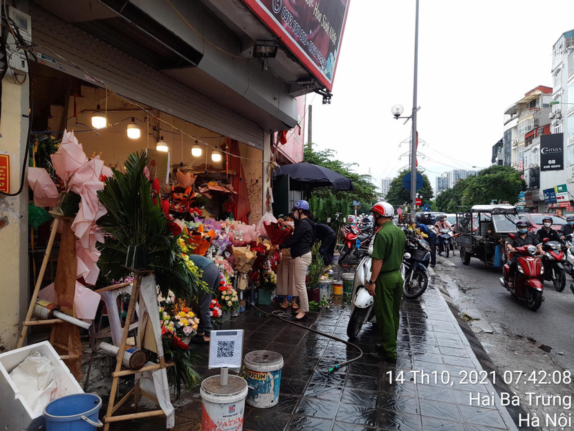 Từ 8h sáng 14/10, đồng loạt Công an 18 phường và Đội CSGTTT đã ra quân tuyên truyền, xử lý chợ cóc, chợ tạm, hàng rong tái diễn, nhà hàng và các cơ sở kinh doanh ăn uống được phép kinh doanh nhưng vi phạm về sử dụng trái phép lòng đường, hè phố để kinh doanh dịch vụ ăn uống và bày bán hàng hóa; tuyên truyền, yêu cầu các nhà hàng, cơ sở kinh doanh dịch vụ ăn uống phục vụ tại chỗ không quá 50% chỗ ngồi, đảm bảo khoảng cách có vách ngăn, chủ cơ sở và nhân viên phải được tiêm 2 mũi vaccine phòng dịch Covid-19, thực hiện nghiêm 5K, bắt buộc khách hàng thực hiện quét mã QR-code.