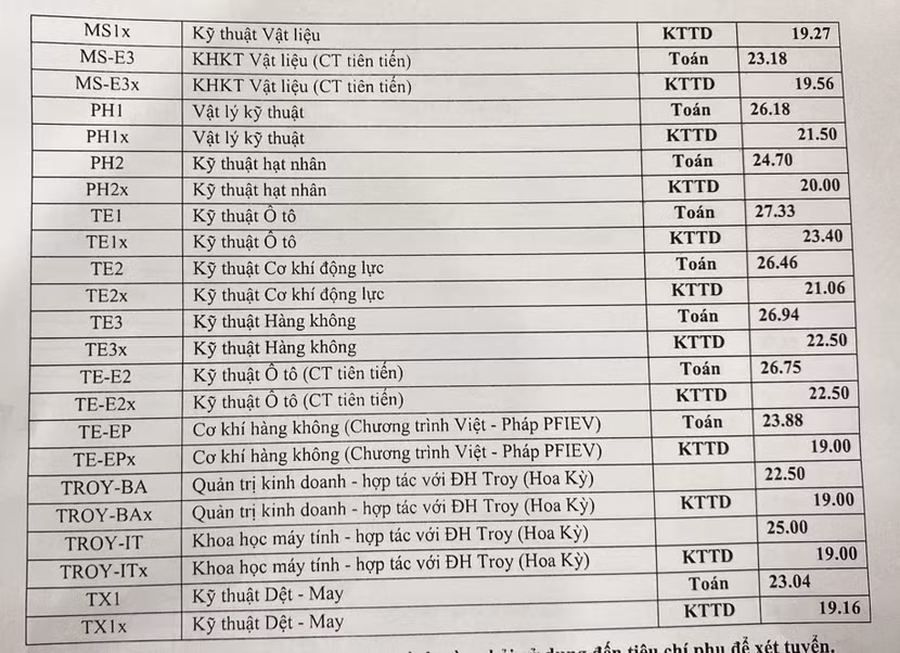 Các ngành Kỹ thuật máy tính, Khoa học dữ liệu và Trí tuệ nhân tạo với điểm chuẩn lần lượt là 28,65. Các ngành có điểm chuẩn vào trường thấp nhất là 19.