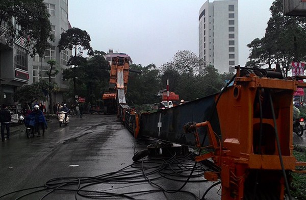 Xe cẩu với chiều dài 50m và có trọng lượng hàng chục tấn giáng xuống, rất may khi xảy ra sự vụ không có người lưu thông qua đây