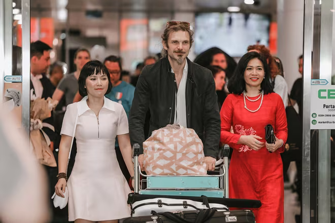 Ông Tony Nguyễn (ngoài cùng bên phải) đại diện IB Group cùng các cộng sự ra sân bay đón các nghệ sĩ của Dàn nhạc Giao hưởng Nhà hát Hoàng gia Versailles |