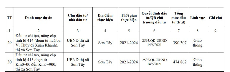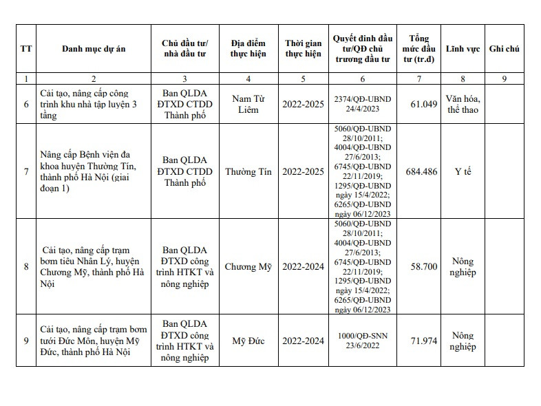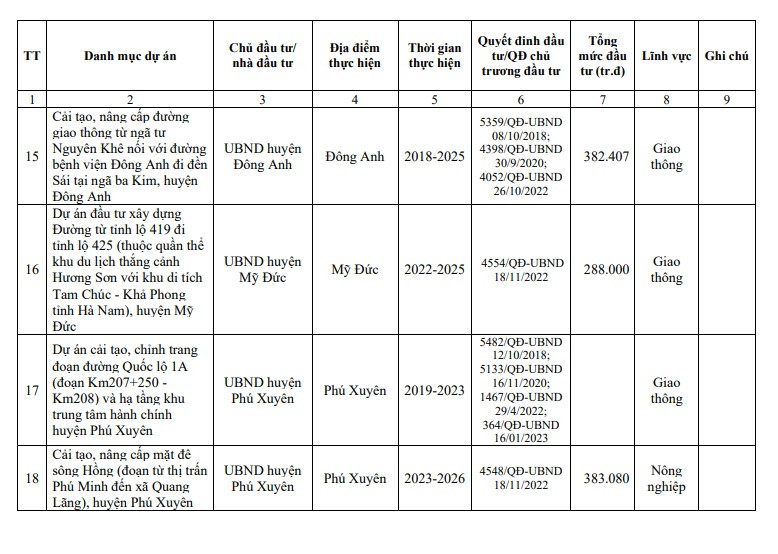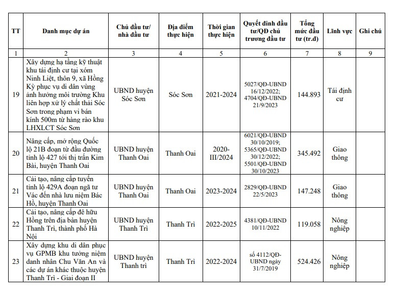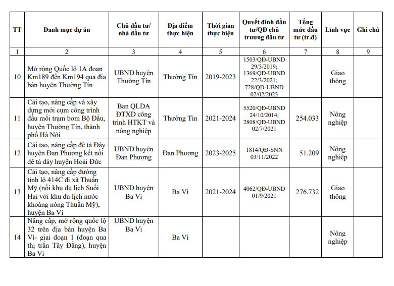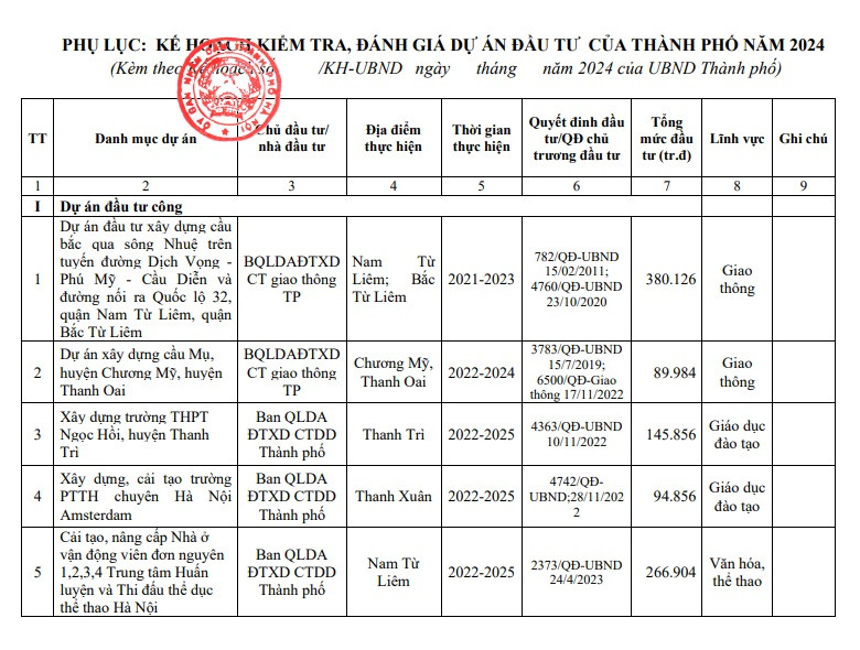 Trong 30 dự án đầu tư công sẽ bị kiểm tra có các dự án đáng chú ý như: Dự án đầu tư xây dựng cầu bắc qua sông Nhuệ trên tuyến đường Dịch Vọng - Phú Mỹ - Cầu Diễn và đường nối ra Quốc lộ 32, quận Nam Từ Liêm, quận Bắc Từ Liêm; Dự án xây dựng cầu Mụ, huyện Chương Mỹ, huyện Thanh Oai; Nâng cấp Bệnh viện đa khoa huyện Thường Tín, thành phố Hà Nội (giai đoạn 1); Nâng cấp, mở rộng quốc lộ 32 trên địa bàn huyện Ba Vì- giai đoạn 1 (đoạn qua thị trấn Tây Đằng); Dự án cải tạo, chỉnh trang đoạn đường Quốc lộ 1A (đoạn Km207+250 - Km208) và hạ tầng khu trung tâm hành chính huyện Phú Xuyên; Xây dựng khu di dân phục vụ GPMB khu tưởng niệm danh nhân Chu Văn An và các dự án khác thuộc huyện Thanh Trì - Giai đoạn II…