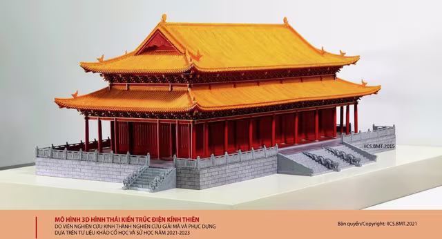 Đặc biệt, trong quá trình nghiên cứu chức năng, kỹ thuật các loại ngói lợp mái và cấu kiện gỗ đào được tại di tích, năm 2022 - 2023 Viện Nghiên cứu Kinh thành đã hoàn thành chương trình nghiên cứu giải mã, phục dựng 3D hình thái kiến trúc điện Kính Thiên - tòa chính điện quan trọng nhất trong Cấm thành Thăng Long thời Lê sơ. Đây là tòa điện xây dựng trên cấp nền cao, phía trước có thềm bậc đá chạm rồng, trên thềm điện có lan can đá bao quanh kiến trúc gỗ được sơn son màu đỏ sặc sỡ. Kiến trúc có quy mô to lớn, gồm 9 gian (7 gian 2 chái), diện tích khoảng 1.188m2, chiều ngang có 10 cột, chiều dọc có 6 cột, thuộc loại kiến trúc đấu củng, trùng diêm, trên mái lợp ngói rồng men vàng đặc sắc và được trang trí bằng các tượng đầu rồng thể hiện quyền lực của vương triều.