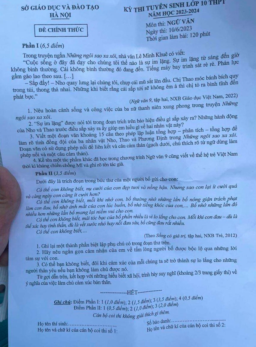 Phần I (6,5 điểm): Những ngôi sao xa xôi của Lê Minh Khuê là một văn bản tương đối quen thuộc với thí sinh, văn bản này đã xuất hiện nhiều lần trong đề thi tuyển sinh lớp 10 tại Hà Nội. Với yêu cầu tái hiện kiến thức của câu 1,2,4, các thí sinh sẽ không gặp bất cứ khó khăn nào. Tuy nhiên, ở câu hỏi số 3 khi viết đoạn văn theo phép lập luận tổng – phân – hợp để phân tích về tình đồng đội của ba nhân vật Nho, Thao và Phương Định, các thí sinh cần lưu ý về dung lượng (khoảng 15 câu) tránh viết lan man, không làm rõ yêu cầu của đề.