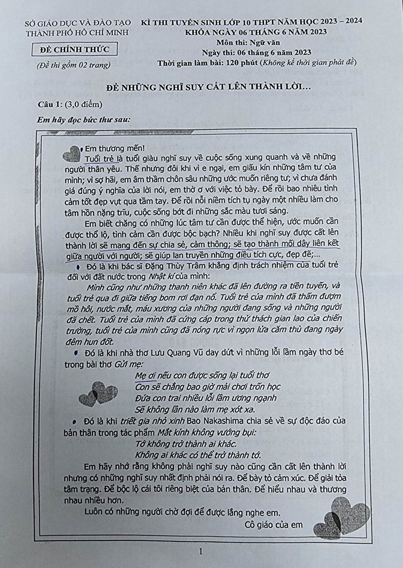 Theo tổ Ngữ văn, hệ thống Giáo dục HOCMAI, cấu trúc đề thi của năm nay tương tự như năm 2022-2023, gồm có 03 câu và (theo trục chủ đề và đọc hiểu 2 văn bản). Chủ đề “Để những nghĩ suy cất lên thành lời” của đề khá hay, độ phân hoá của đề thi rất tốt; do vậy, dự kiến kiến phổ điểm trung bình dao động từ 6.0 - 7.0 điểm