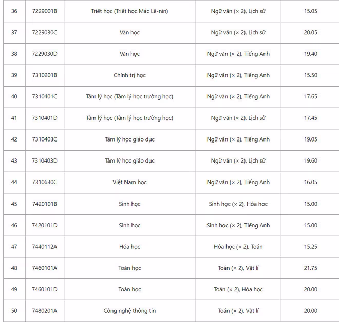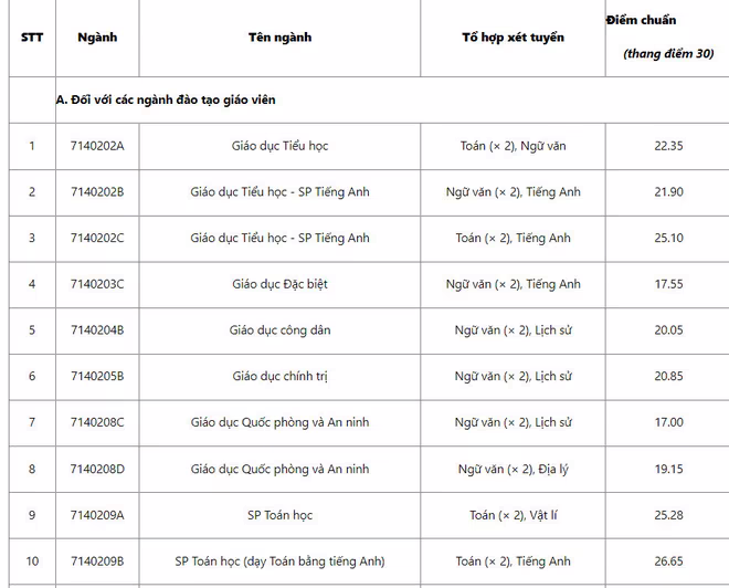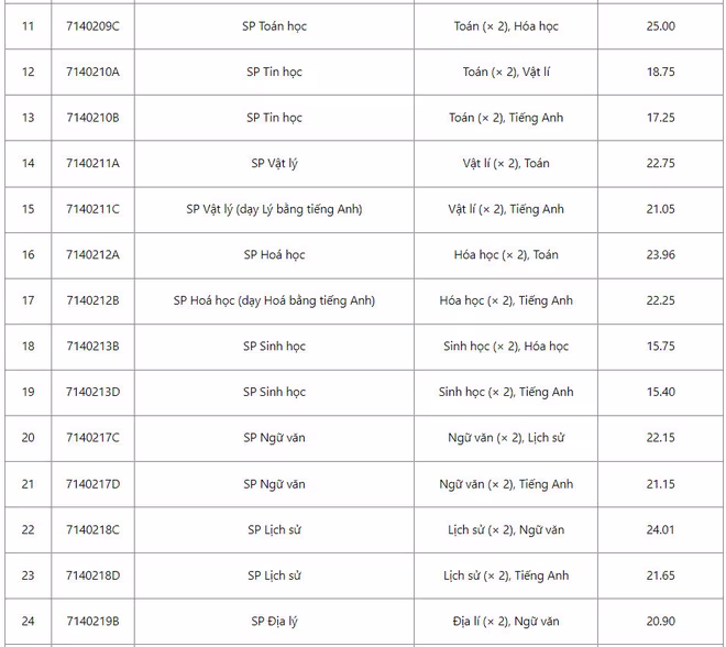 Điểm chuẩn cao tiếp theo là ngành Sư phạm Toán (tổ hợp xét tuyển gồm Toán và Hóa lấy 25 điểm và tổ hợp xét tuyển Toán và Lý lấy 25,28). Ngành Giáo dục tiểu học - Sư phạm Tiếng Anh có điểm chuẩn là 25,1 điểm.