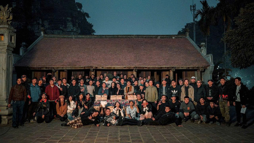 | Đạo diễn Nhân Sơn cùng êkip và đoàn làm phim "Tận hiến" |
