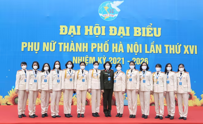 | Đoàn đại biểu Phụ nữ CATP Hà Nội chụp ảnh lưu niệm với Bí thư Thành ủy Hà Nội Đinh Tiến Dũng, Chủ tịch UBND thành phố Hà Nội Chu Ngọc Anh, Chủ tịch HĐND Nguyễn Ngọc Tuấn, Giám đốc Công an Hà Nội Nguyễn Hải Trung |