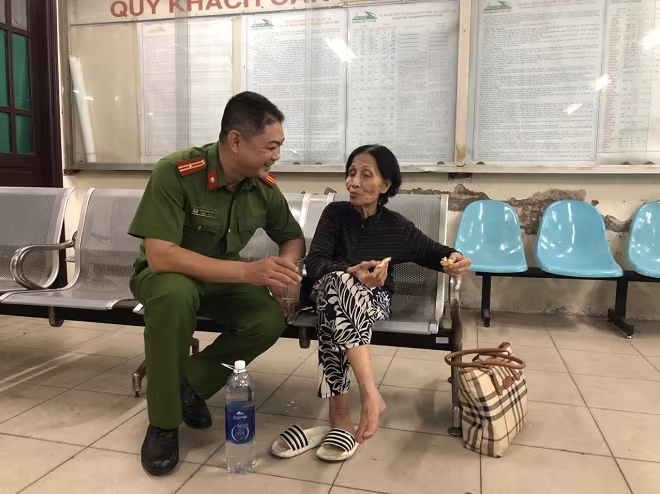 Trước đó, khoảng 21h tối 7-7, Trung tá Tạ Xuân Lộc - Phó Trưởng Đồn Công an đường sắt Ga Hà Nội cùng Thiếu tá Phạm Hồng Quân làm nhiệm vụ tuần tra kiểm soát, đảm bảo an ninh trật tự khu vực quanh ga thì phát hiện một cụ bà ngoài 80 tuổi đang ngồi ở đường ke số 6 cùng nhiều đồ đạc.
