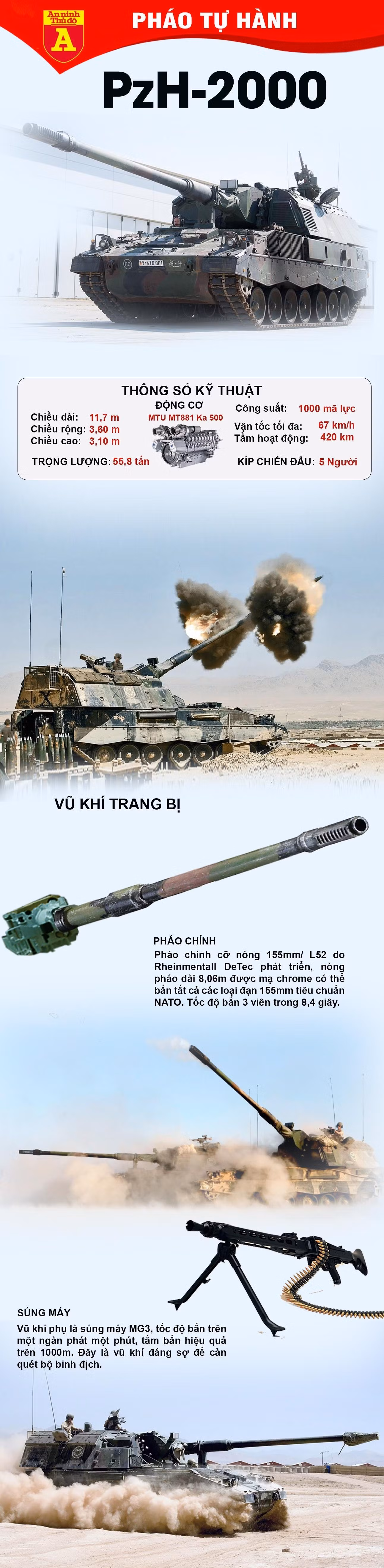PzH-2000 sử dụng khung gầm xe tăng Leopard 2, trên đó lắp một tháp pháo xoay với pháo chính 155 mm/L52 (chiều dài nòng gấp 52 lần đường kính). PzH-2000 mang theo cơ số 60 viên đạn pháo, tầm bắn tối đa đạt 30km đối với đạn thường và 40km với đạn tăng tầm. Tốc độ bắn qua kiểm chứng thực tế đạt 3 viên/8,4 giây; 12 viên/59,74 giây và 20 viên/1 phút 47 giây; pháo chính có góc nâng hạ từ -2,5° - +65°.