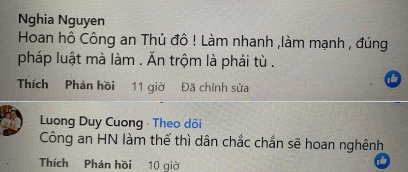 Ngay sau đó, bạn đọc Luong Duy Cuong bình luận: "Công an Hà Nội làm thế thì dân chắc chắn sẽ hoan nghênh". Bạn đọc Nghĩa Nguyễn: "Hoan hô Công an Thủ đô. Làm nhanh, làm mạnh, đúng pháp luật mà làm".