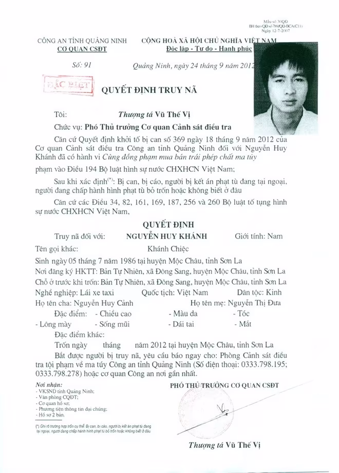 Ngày 05/11/2025, sau hơn 13 năm lẩn trốn, Nguyễn Huy Khánh (SN 1986, nơi thường trú bản Tự Nhiên, xã Đông Sang, huyện Mộc Châu, tỉnh Sơn La (nay là tổ dân phố Tự Nhiên, phường Mộc Sơn, tỉnh Sơn La); "mắt xích" trong đường dây hoạt động mua bán, vận chuyển trái phép chất ma tuý xuyên quốc gia bị Công an tỉnh Quảng Ninh triệt phá năm 2012, đã chủ động từ nơi lẩn trốn tại phường Bình Chánh, TP Hồ Chí Minh về đầu thú với tổ công tác Phòng CSĐT tội phạm về ma túy Công an tỉnh Quảng Ninh.