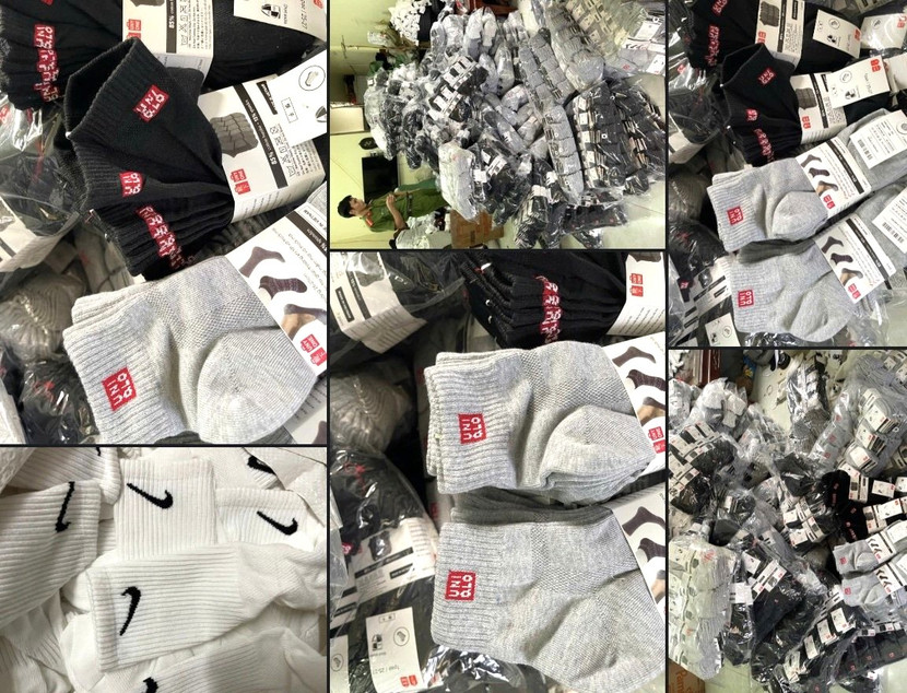 Đáng chú ý, tại hiện trường có tổng cộng:13.150 đôi tất gắn nhãn hiệu UNIQLO; 1.660 đôi tất mang hình biểu tượng NIKE; 1.670 đôi tất có chữ ĐLS...Tất cả số hàng hóa này đều có dấu hiệu giả mạo nhãn hiệu đang được bảo hộ tại Việt Nam. Ngoài ra, lực lượng chức năng còn phát hiện tại cơ sở 294kg sợi chưa qua sử dụng, được xác định là nguyên liệu để sản xuất số tất trên.