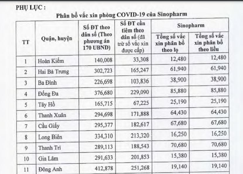 Trong 30 quận, huyện, thị xã, Hà Nội phân bổ lượng vaccine Sinopharm nhiều nhất cho quận Hoàng Mai với gần 147.000 liều, Hà Đông gần 104.000 liều, Đống Đa gần 86.000 liều, Thanh Trì có 70.000 liều, Cầu Giấy có gần 68.000 liều, Thanh Xuân gần 64.000 liều, Hai Bà Trưng có gần 62.000 liều, Bắc Từ Liêm gần 55.000 liều…