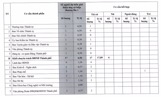 Dự kiến cơ cấu, thành phần, phân bổ số lượng người được giới thiệu ứng cử đại biểu HĐND TP khóa XVII, nhiệm kỳ 2026-2031 như sau: