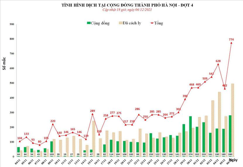 Sở Y tế Hà Nội tối 6/12 thông báo 24 giờ qua ghi nhận 774 ca nhiễm COVID-19 mới, cao hơn 310 ca so với hôm qua, trong đó có 280 ca cộng đồng, khu cách ly (343), khu phong tỏa (151).