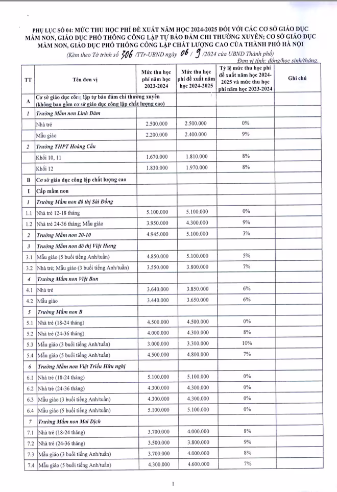 Mức thu học phí năm học 2024-2025 được đề xuất tăng từ 0-10%, trong đó những trường có mức tăng cao nhất (10%) gồm: Trường tiểu học Tràng An, THCS Nam Từ Liêm, THCS Cầu Giấy.
