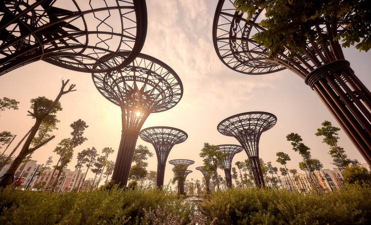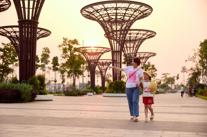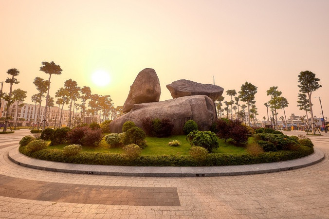 Không gian quảng trường được chăm chút xanh mát với hệ thống cây trồng dọc trục đại lộ, những thảm cỏ được cắt tỉa hàng ngày. Đặc biệt, dấu ấn văn hóa bản địa thấm đẫm trong từng góc kiến trúc, cảnh quan: biểu tượng Hòn Trống Mái hay họa tiết trống đồng Đông Sơn được đan cài trong kiến trúc tổng thể. Mặt đường trên quảng trường được lát đá cubic có nguồn gốc tự nhiên phối 3 màu lấy cảm hứng từ các đại lộ nổi tiếng trên thế giới Champs-Élysées.
