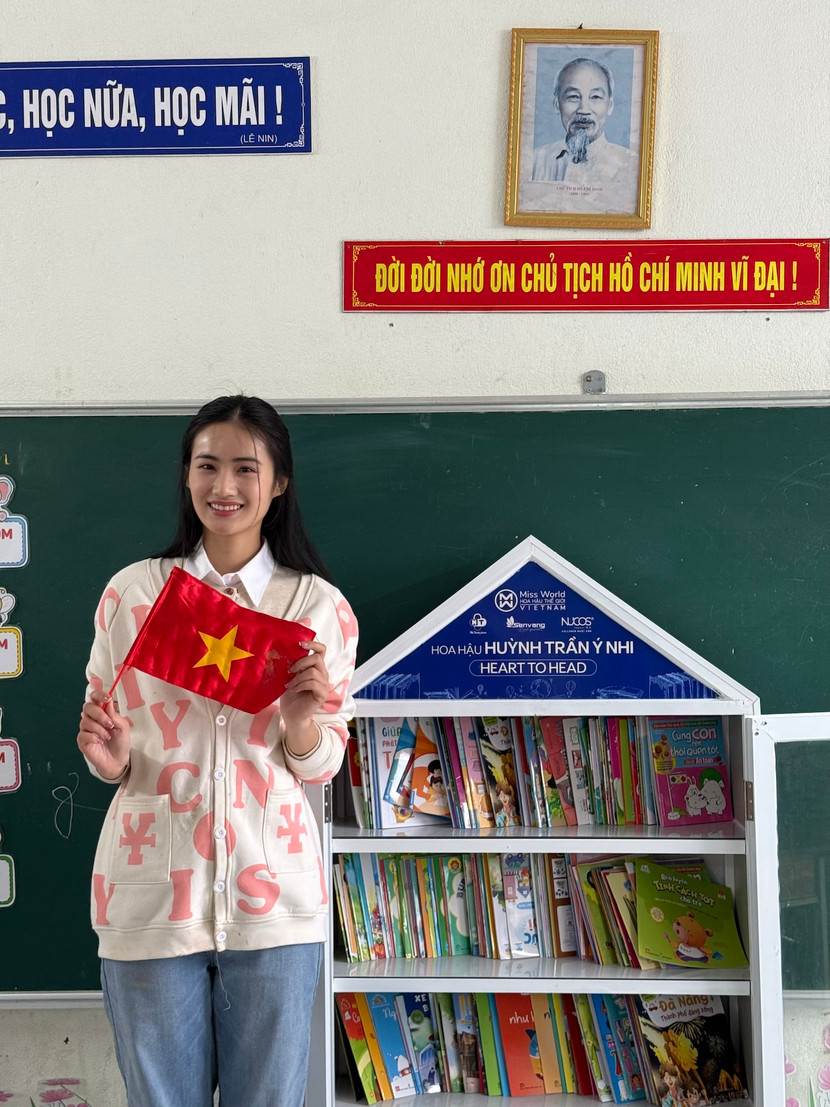 Tại buổi lễ, hoa hậu Ý Nhi chia sẻ hoạt động trao tặng tủ sách nằm trong dự án "Heart to head" được cô mang đến cuộc thi Miss World lần thứ 72.
