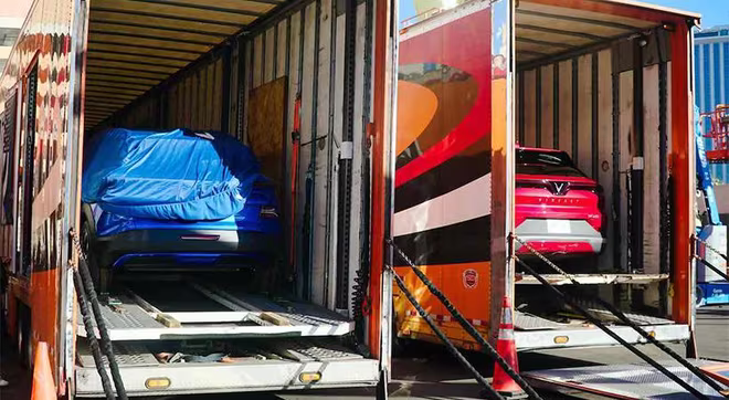 Rạng sáng ngày 4/1 (giờ Việt Nam), tại Trung tâm triển lãm và hội nghị Las Vegas (Nevada, Mỹ), dàn xe containter cỡ lớn mang theo những chiếc xe điện VinFast chính thức xuất hiện thu hút sự chú ý của những người có mặt.
