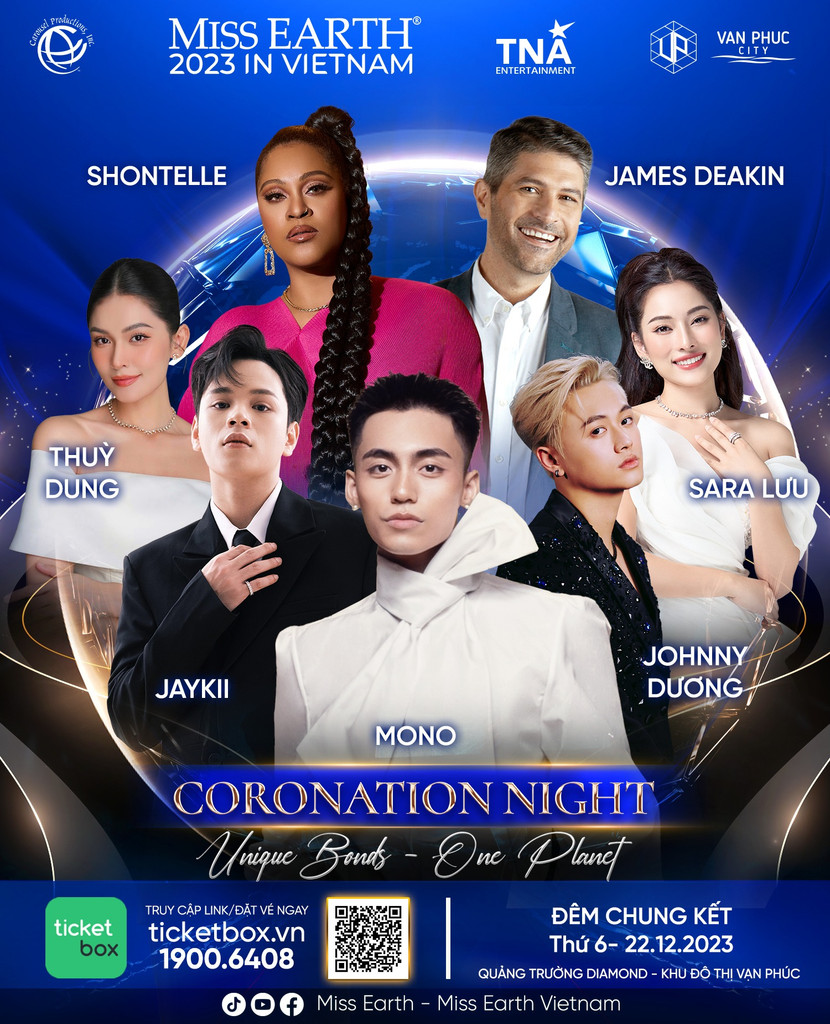 Chung kết cuộc thi Miss Earth 2023 sẽ diễn ra vào lúc 19h30 tại Quảng trường Diamond, Khu đô thị Vạn Phúc- Thủ Đức, được trực tiếp trên nhiều kênh truyền hình quốc tế. Ngoài các phần thi của thí sinh, đêm thi còn có sự góp mặt của dàn nghệ sĩ đình đám: Mono, Shontell, Jaykii và Sara Lưu. Chương trình sẽ do MC James Deakin và Á hậu Thùy Dung đảm nhận dẫn dắt.