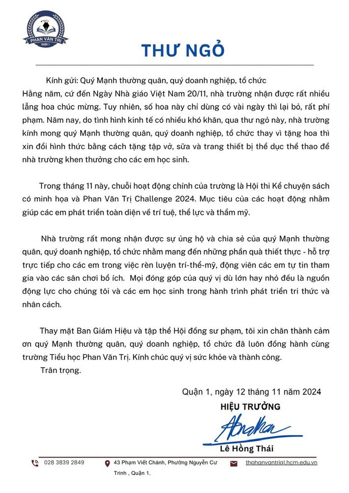 Nhiều phụ huynh học sinh đang rất quan tâm tới bức thư ngỏ của thầy hiệu trưởng trường tiểu học Phan Văn Trị (Quận 1, TP. Hồ Chí Minh) khi thẳng thắn chia sẻ mong muốn việc tặng hoa rất phí phạm và có thể thay bằng cách thức ý nghĩa hơn.