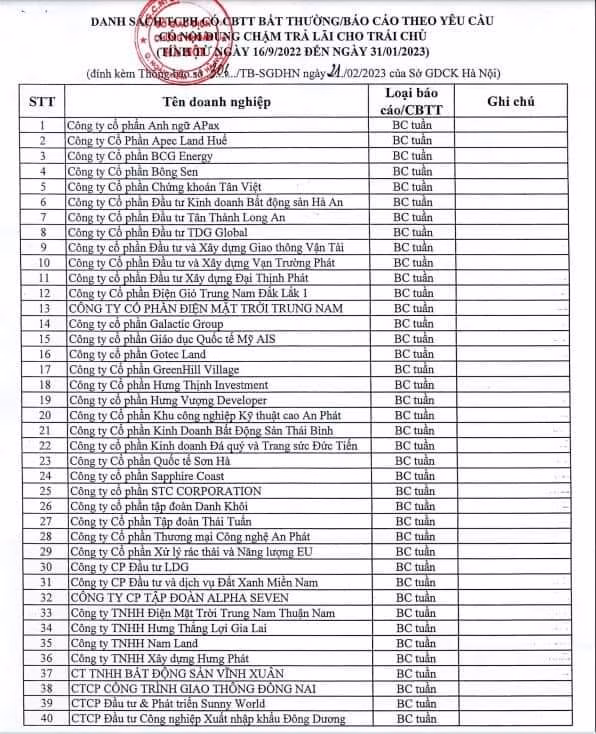 Một số doanh nghiệp nổi bật về chậm trả nợ trái phiếu trong danh sách này là: Công ty CP Anh ngữ Apax, Công ty CP Chứng khoán Tân Việt, Công ty CP Điện mặt trời Trung Nam, Công ty CP Tập đoàn Danh Khôi, Công ty CP địa ốc Sài Gòn Thương tín, Công ty CP Tập đoàn Đầu tư Địa ốc Nova, Công ty CP Hưng Thịnh Incons, Công ty CP Hưng Thịnh Investment, Công ty CP Đầu tư Hải Phát, Công ty CP Tập đoàn Thái Tuấn, Công ty CP Đầu tư LDG, Công ty CP Tập đoàn đầu tư An Đông, Công ty CP Dịch vụ Đất Xanh Miền Nam…