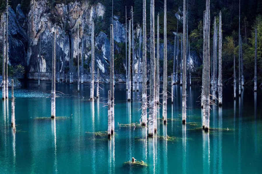ANTD.VN - Ở hồ Kaindy, dưới đáy hồ, lá cây vẫn mọc xanh tốt, nhưng ở trên mặt nước lại trơ trọi như những cây cọc khô héo được cắm xuống, tạo nên một bức chân dung hấp dẫn đối với những người tò mò ưa mạo hiểm.