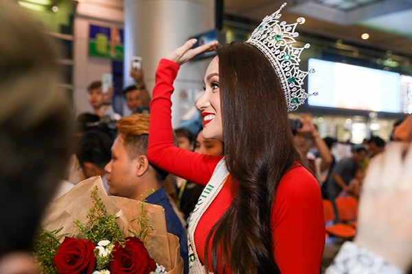 Mới đây, ngay sau khi đáp chuyến bay về Việt Nam, Hương Giang gây chú ý khi diện áo dài truyền thống và mang 7 chiếc vali chứa đựng hàng chục kg hành lý. Nữ ca sĩ bị bao vây bởi hàng trăm fans hâm mộ có mặt tại sân bay Tân Sơn Nhất từ trưa để chào đón và bày tỏ sự ngưỡng mộ trước những nỗ lực của tân Hoa hậu. Cô còn nhận được hoa và những món quà hand-made do các fans tặng.