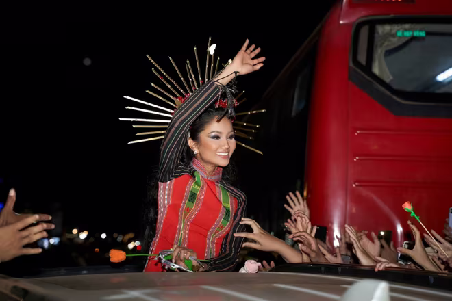 Diện áo dài thổ cẩm, Hoa hậu H'Hen Niê nổi bật cùng nụ cười rạng rỡ và vương miện cà phê lộng lẫy