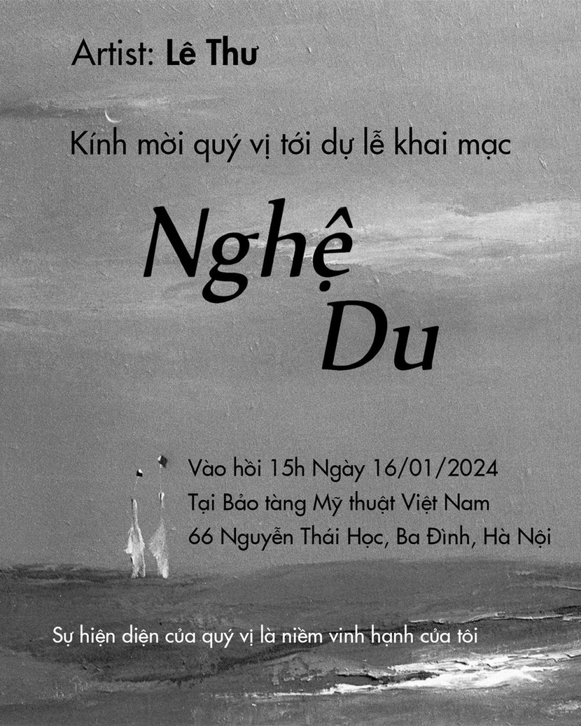 Triển lãm tranh Nghệ Du sẽ chào đón khách tham quan trong vòng 7 ngày; khai mạc hồi 15h ngày 16/01/2024 và trưng bày đến hết ngày 21/01/2024, tại tầng 2, Bảo tàng Mỹ thuật Việt Nam, số 66 Nguyễn Thái Học, quận Ba Đình, TP. Hà Nội.