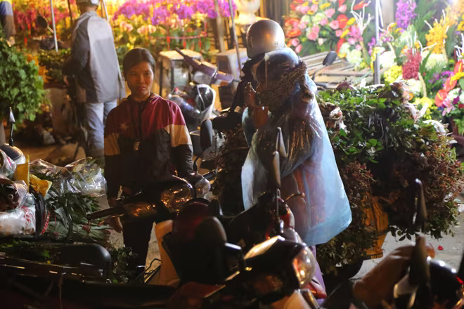 Người lao động ở chợ hoa Quảng Bá, Tây Hồ phải bịt kín khăn mũ chống rét Ảnh: lam thanh |