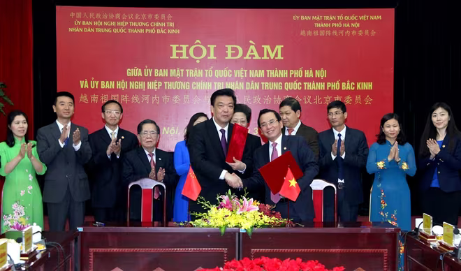 Ông Vũ Hồng Khanh, Chủ tịch Ủy ban MTTQ Việt Nam TP Hà Nội cùng Ban Thường trực Ủy ban MTTQ thành phố thân mật tiếp đoàn Chính hiệp thành phố Bắc Kinh. Về phía Trung Quốc do ông Cát Lâm, Chủ tịch Chính hiệp thành phố Bắc Kinh dẫn đầu cùng các thành viên trong đoàn.