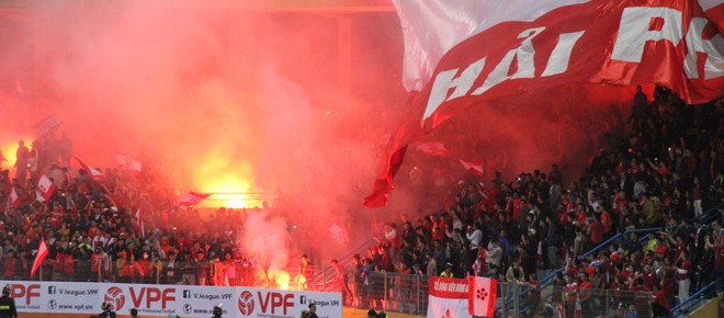 Hơn 30 quả pháo sáng xuất hiện trên khu vực CĐV Hải Phòng và một số bị ném xuống sân Hàng Đẫy khiến trận đấu bị gián đoạn