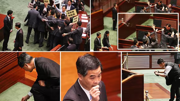 Cũng trong ngày 3-7, trong phiên họp của Hội đồng lập pháp, Trưởng đặc khu Hồng Kông, ông Lương Chấn Anh đã bị ném cốc nước vào người, trong khi nhiều người khác cầm biểu ngữ và yêu cầu “phổ thông đầu phiếu thực sự, không có sự sàng lọc trước”. Đây là lần đầu tiên kể từ khi Hội đồng lập pháp của đặc khu này được thành lập, xảy ra tình trạng hỗn loạn trong cuộc họp Hội đồng lập pháp và cảnh sát phải can thiệp. Ông Lương Chấn Anh không bị thương nhưng ông cho biết hành vi và ngôn từ của một số nhà lập pháp “ngày càng cực đoan”. Ông Lương Chấn Anh, người đã khẳng định sẽ không từ chức, thừa nhận ông thất bại trong sự nghiệp phục vụ người dân ở đặc khu hành chính này.