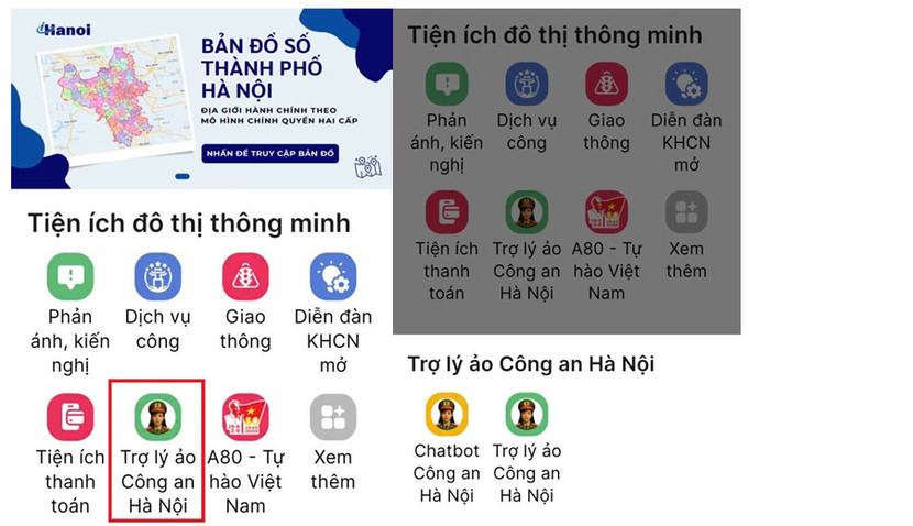 - Đăng nhập iHanoi, chọn biểu tượng Trợ lý ảo Công an Hà Nội