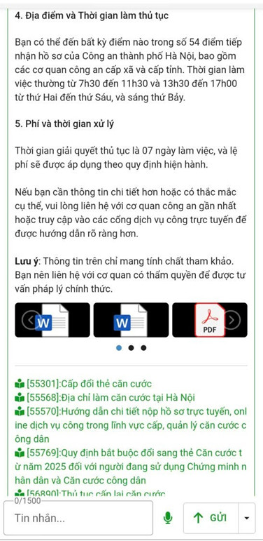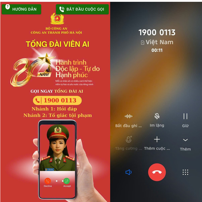 3. Kết nối điện thoại tới đầu số hotline 1900.0113 để kết nối nhân viên AI để đặt câu hỏi qua các nhánh: Số 1 - hỏi đáp thủ tục hành chính hoặc các thông tin tuyên truyền về phòng cháy, giao thông, phòng chống tội phạm; Số 2 - tiếp nhận tố giác tội phạm, phản ánh hành vi vi phạm liên quan ANTT. Hệ thống sẽ tự động cung cấp thông tin hữu ích hoặc tiếp nhận thông tin mà Nhân dân cung cấp.