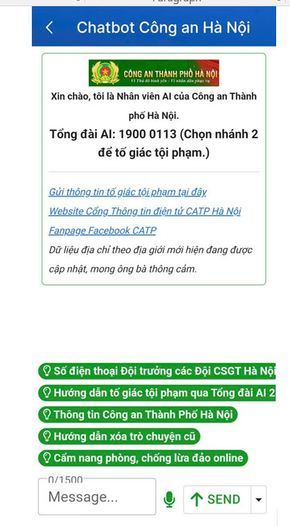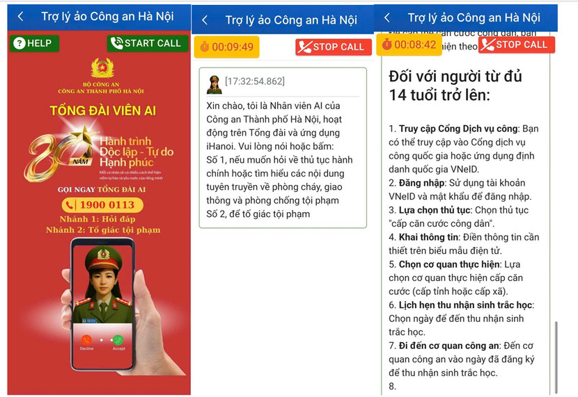 Tập trung hướng dẫn người dân thực hiện thủ tục hành chính, tố giác tội phạm và các hành vi vi phạm pháp luật khác; hướng dẫn người dân các kỹ năng phòng chống tội phạm, bảo đảm an toàn phòng chống cháy, nổ và cung cấp các thông tin hữu ích liên quan lực lượng Công an; tự động cung cấp số điện thoại cấp Trưởng phòng, Trưởng Công an cấp xã để người dân kết nối. Qua đó, giúp người dân dễ dàng hỏi đáp và phản ánh thông tin mọi lúc, mọi nơi.